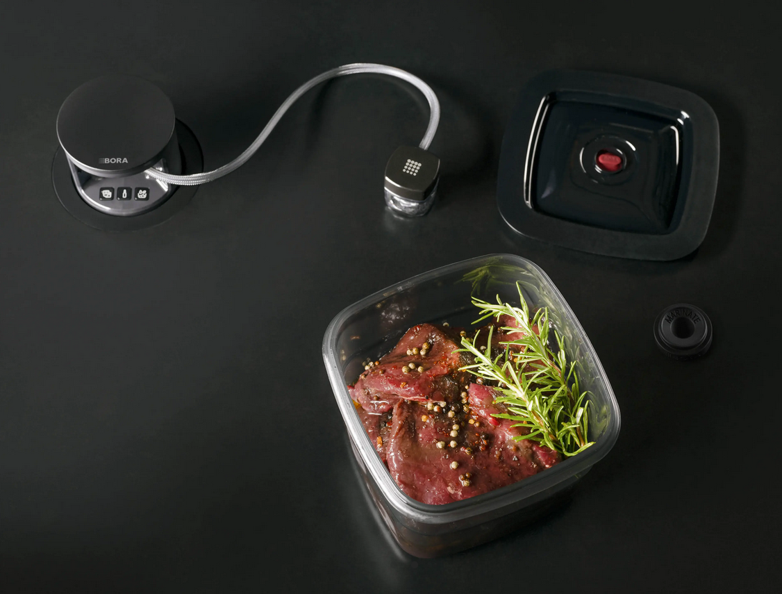 Próżniowe zamykanie za pomocą BORA QVac umożliwia dłuższe przechowywanie żywności bez utraty jej naturalnego smaku lub konsystencji. Duży pojemnik próżniowy BORA ma pojemność dwóch litrów. Większe porcje gotowanych posiłków można zamknąć próżniowo w tych pojemnikach i przechowywać przez kilka dni, a nawet zamrozić. W połączeniu z pierścieniem do marynowania, ryby lub mięso mogą być optymalnie marynowane w tych pojemnikach w ciągu zaledwie dziesięciu minut.