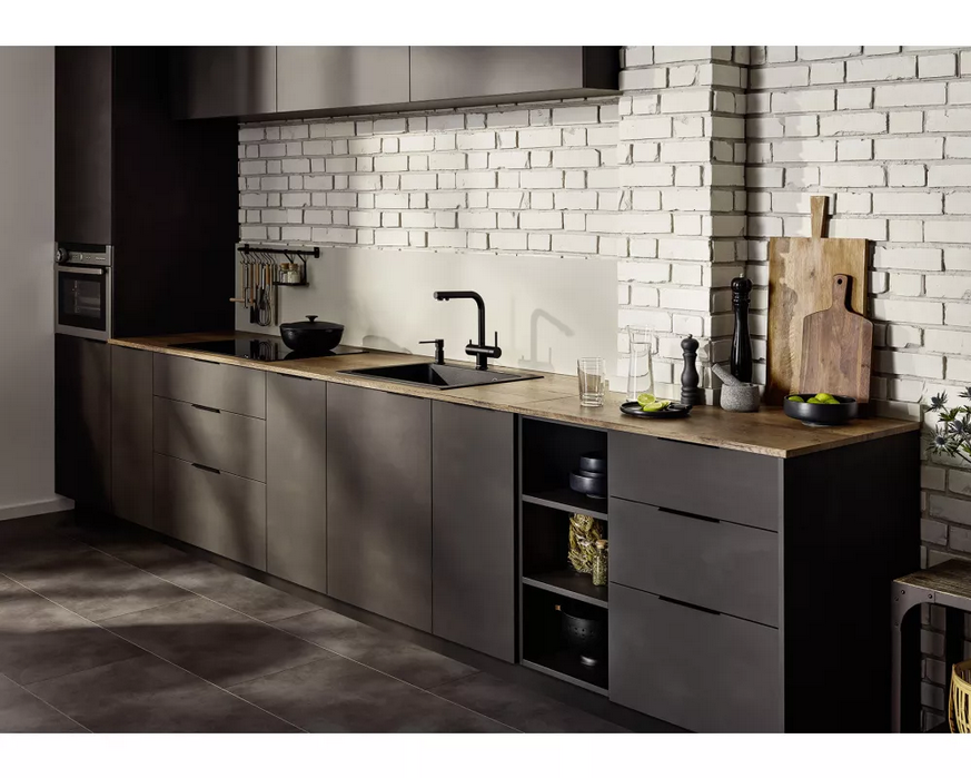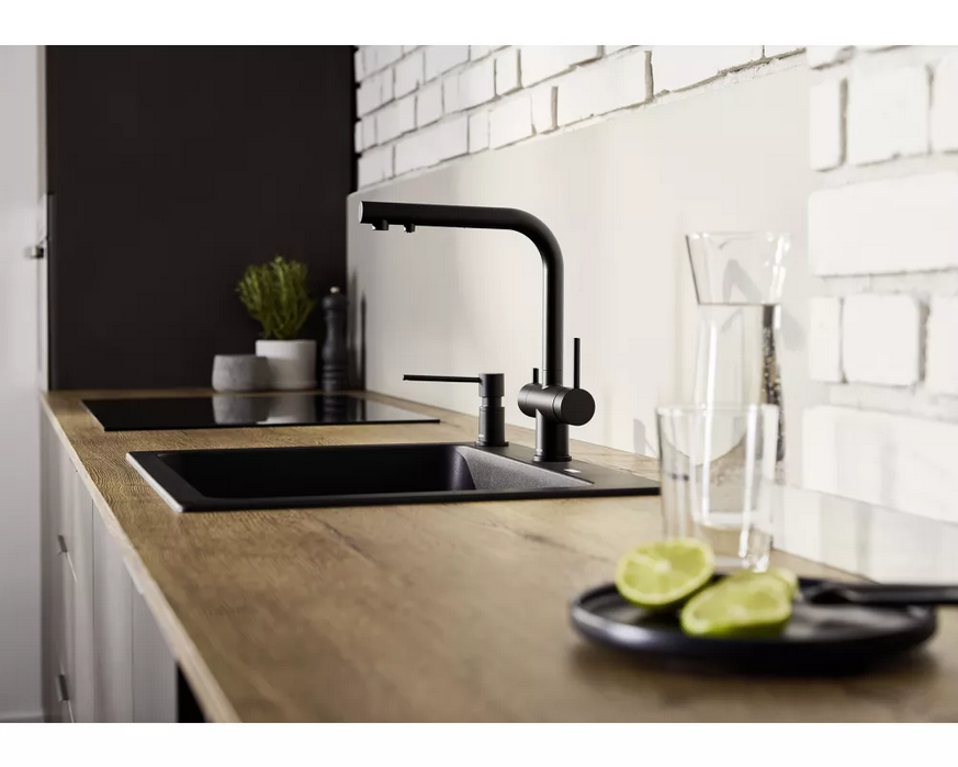 woda filtrowana i niefiltrowana z jednej wylewki z osobnymi kanałami przepływu. Posiada oddzielną dźwignię z prawej strony do wody mieszanej (ciepłej i zimnej ) oraz dźwignię do wody filtrowanej z lewej strony. Wymaga tylko jednego otworu 35 mm do zamocowania baterii, dzięki czemu mamy rozbudowany system dostarczania wody i zaoszczędzamy miejsce. Wyciągana wylewka ułatwia napełnianie naczyń.