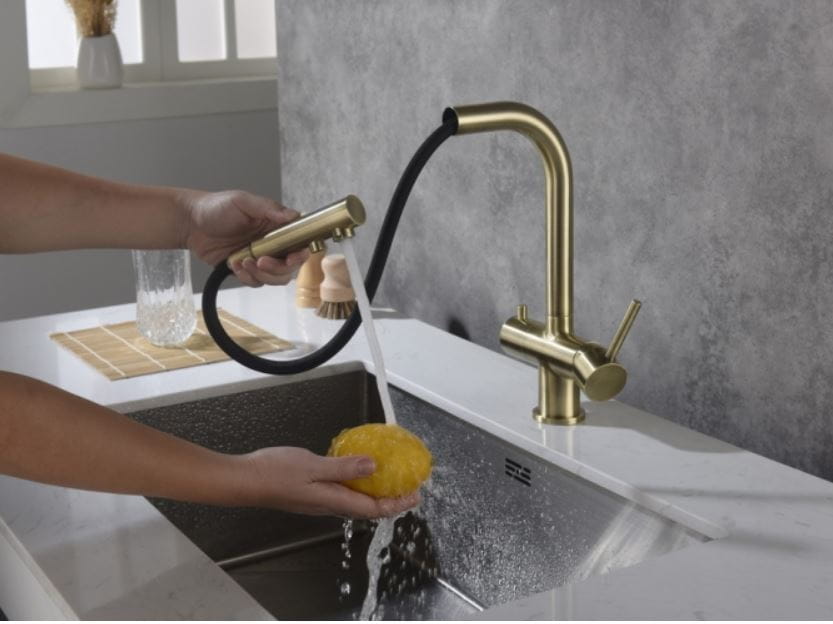 – mieszacz wody ciepłej i zimnej (prawa strona) – podłączenie do wody filtrowanej (lewa strona)