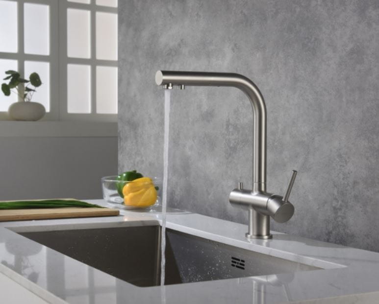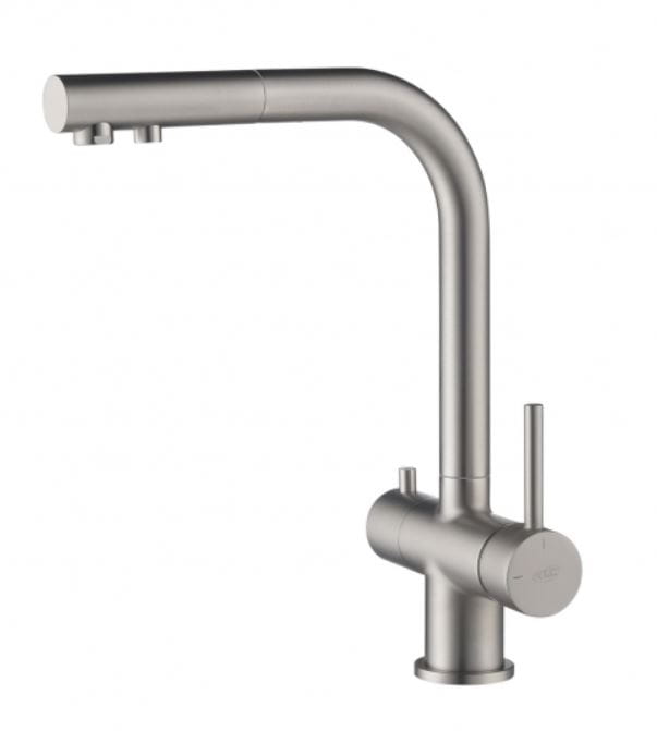– wykończenie: kolor STALI – wylewka obrotowa do 360° – głowice ceramiczne – 2 elastyczne wężyki podłączeniowe 3/8“ – 600 mm – podłączenie do filtra z szybkozłączką – 2 perlatory – rączka mieszacza odchyla się do przodu, dzięki czemu można montować baterię pomiędzy zlewozmywakiem podwieszanym a ścianą.