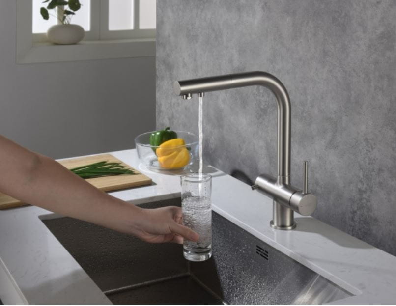 – mieszacz wody ciepłej i zimnej (prawa strona) – podłączenie do wody filtrowanej (lewa strona)