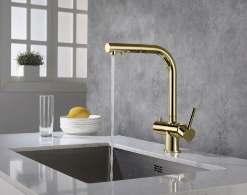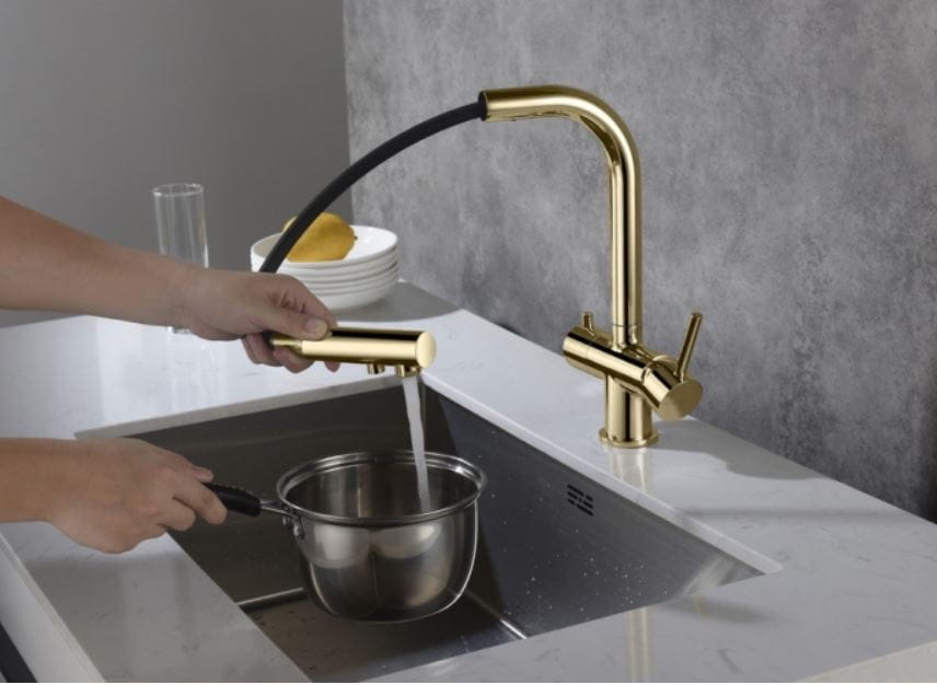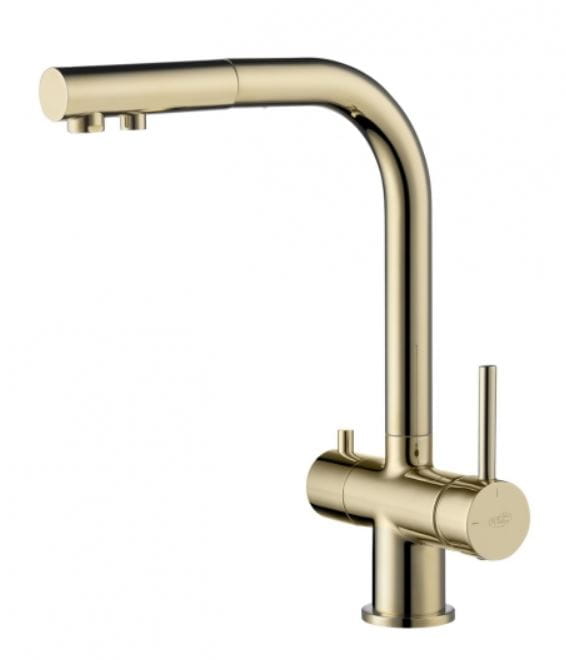 – wykończenie: kolor ZŁOTY – wylewka obrotowa do 360° – głowice ceramiczne – 2 elastyczne wężyki podłączeniowe 3/8“ – 600 mm – podłączenie do filtra z szybkozłączką – 2 perlatory – rączka mieszacza odchyla się do przodu, dzięki czemu można montować baterię pomiędzy zlewozmywakiem podwieszanym a ścianą.