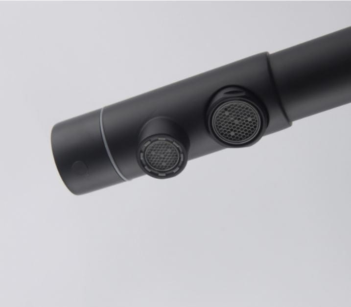 – wykończenie: CZARNY MAT – wylewka obrotowa do 360° – głowice ceramiczne – 2 elastyczne wężyki podłączeniowe 3/8“ – 600 mm – 1 wężyk podłączeniowy do filtra 1/2” – 300 mm z szybkozłączką – 2 perlatory – rączka mieszacza odchyla się do przodu, dzięki czemu można montować baterię pomiędzy zlewozmywakiem podwieszanym a ścianą.