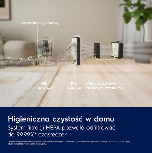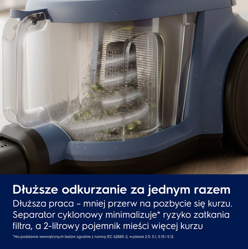 - Bezworkowy: Nie musisz już kłopotać się szukaniem, kupowaniem i przechowywaniem zapasowych worków na kurz. Pojemnik na kurz i filtry są bardzo łatwe w obsłudze.