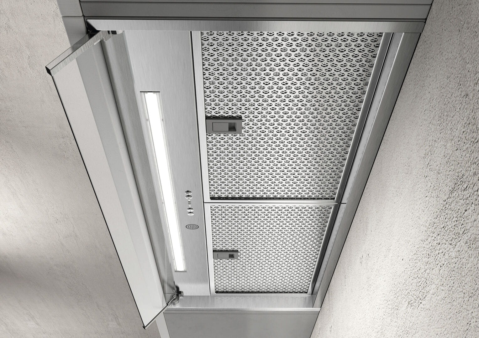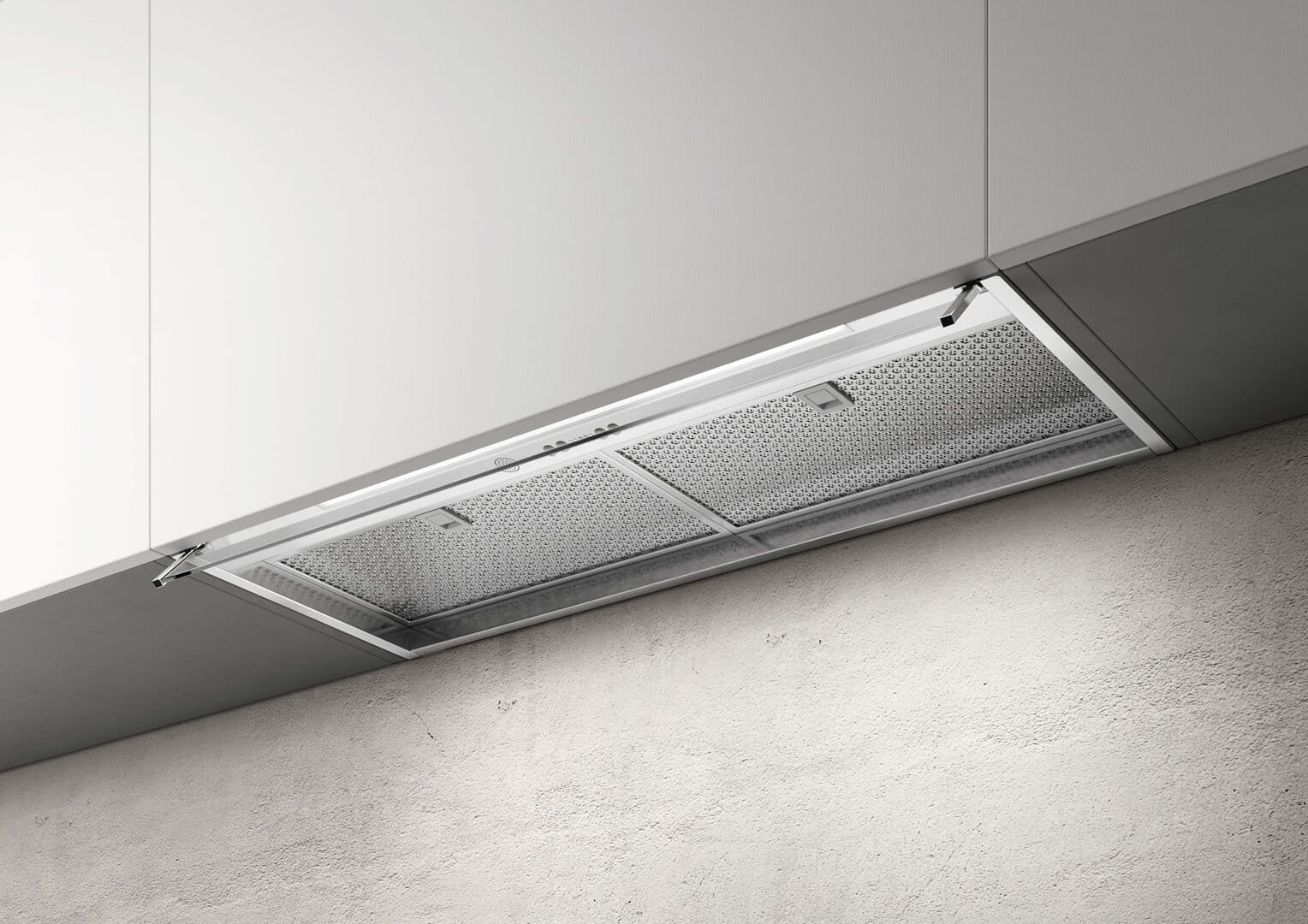 Nowatorski okap od Elica został zaprojektowany tak, by jak najlepiej wykorzystać przestrzeń wewnątrz zabudowy: urządzenie po zamontowaniu pozostawia wygodne miejsce do odstawiania przedmiotów i naczyń kuchennych.