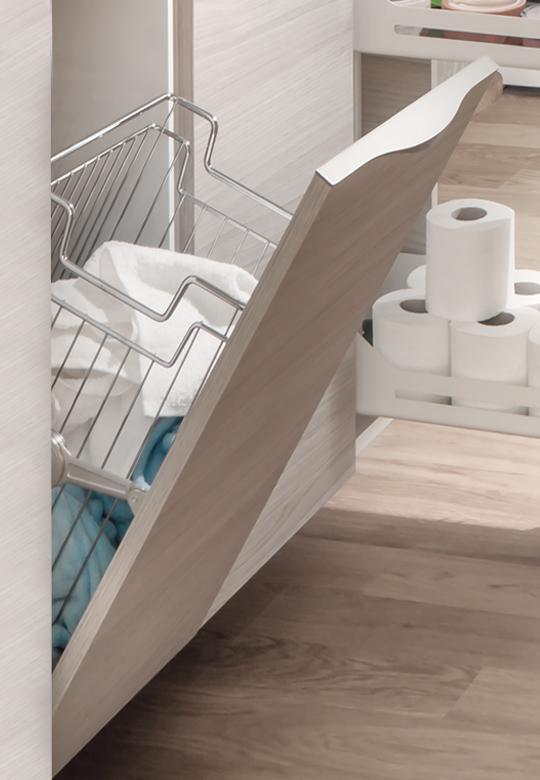Kosz ten, gdy zamontowany jest do frontu szafki uchylnej i uchylany wraz z nim, sprawia, że jest niezwykle praktyczny w użytkowaniu i dodatkowo oszczędza przestrzeń. Ten niewielki, ale bardzo funkcjonalny kosz może znacząco ułatwić codzienne życie, pozwalając na wygodne przechowywanie zabrudzonej odzieży.