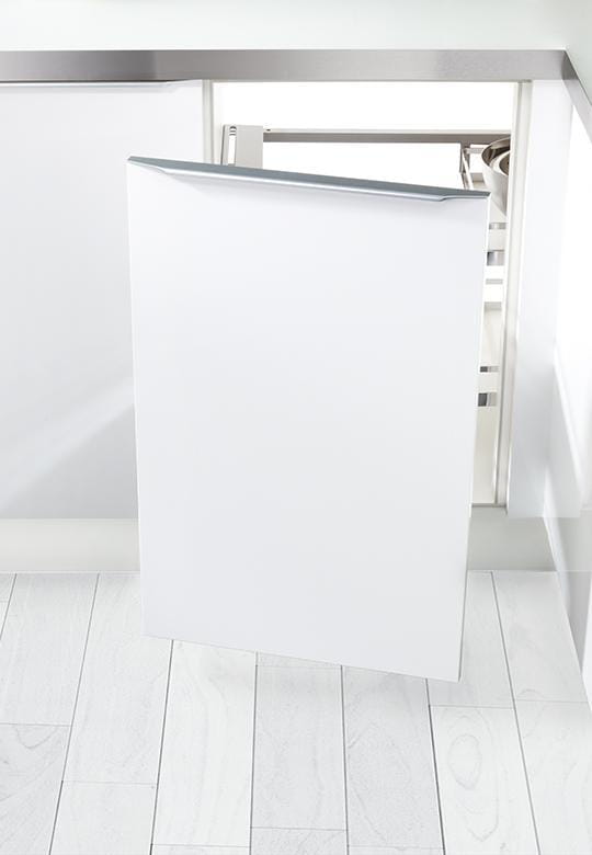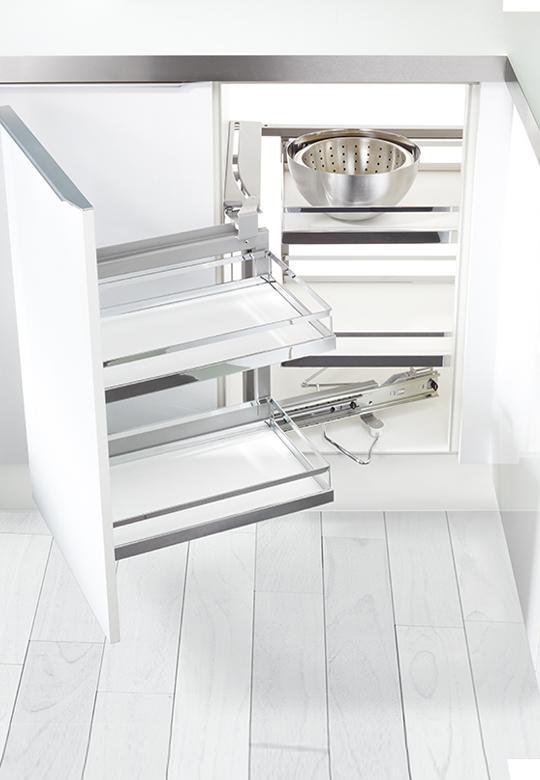 Dzięki Magic Corner ARENA Style użytkowanie szafki narożnej staje się wyjątkowo wygodne. Płynny i cichy ruch mechanizmu zapobiega przesuwaniu się przechowywanych przedmiotów, a solidne, prostokątne półki zapewniają optymalne wykorzystanie przestrzeni. Dodatkową zaletą systemu jest łatwość w utrzymaniu czystości – kosze można z łatwością zdjąć ze stelaża, co ułatwia ich czyszczenie. Hamulec SoftStopp zapewnia ciche i bezpieczne zamykanie szafki.