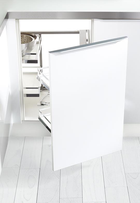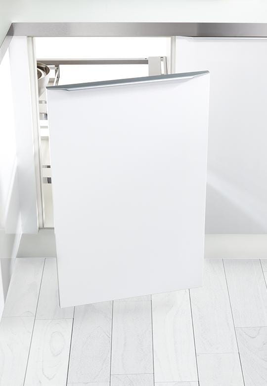 Dzięki Magic Corner ARENA Style użytkowanie szafki narożnej staje się wyjątkowo wygodne. Płynny i cichy ruch mechanizmu zapobiega przesuwaniu się przechowywanych przedmiotów, a solidne, prostokątne półki zapewniają optymalne wykorzystanie przestrzeni. Dodatkową zaletą systemu jest łatwość w utrzymaniu czystości – kosze można z łatwością zdjąć ze stelaża, co ułatwia ich czyszczenie. Hamulec SoftStopp zapewnia ciche i bezpieczne zamykanie szafki.
