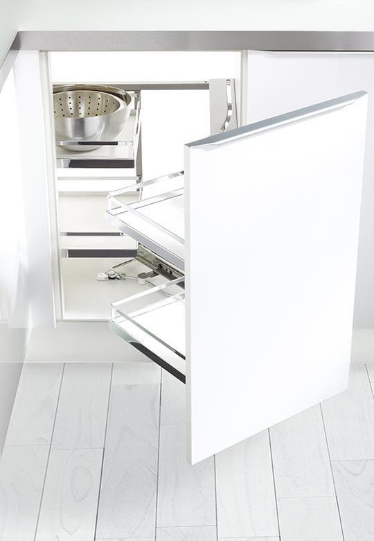 Magic Corner Standard ARENA Style funkcjonalne rozwiązanie, które pozwala przechowywać zarówno duże garnki, jak i mniejsze akcesoria kuchenne, zapewniając maksymalne wykorzystanie przestrzeni w narożnej szafce.