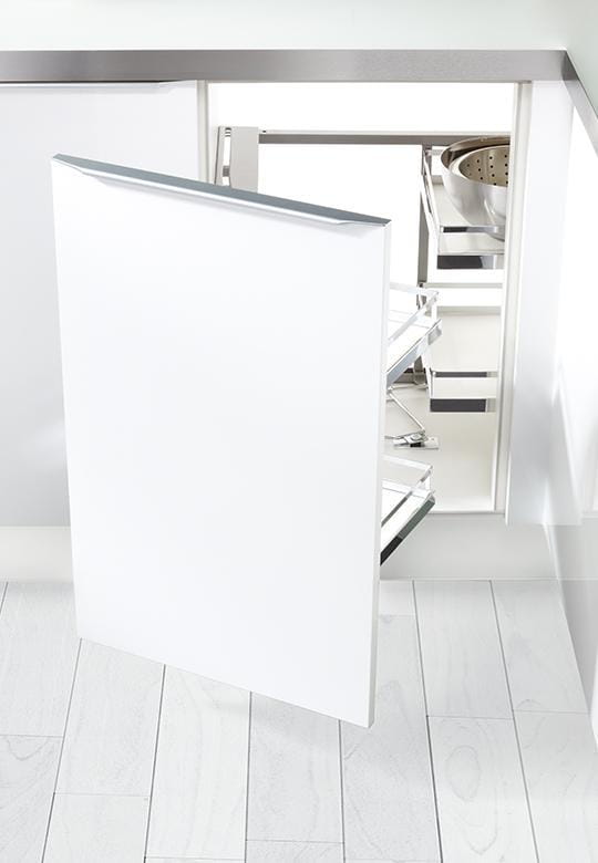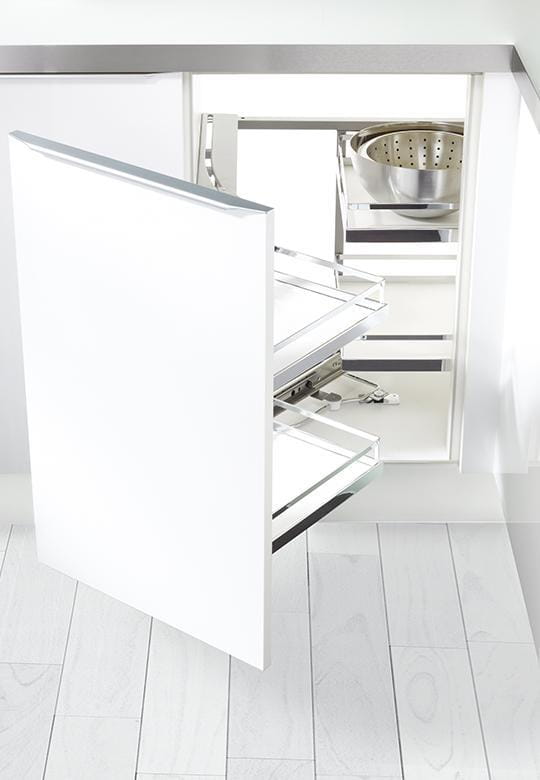 Dzięki Magic Corner ARENA Style użytkowanie szafki narożnej staje się wyjątkowo wygodne. Płynny i cichy ruch mechanizmu zapobiega przesuwaniu się przechowywanych przedmiotów, a solidne, prostokątne półki zapewniają optymalne wykorzystanie przestrzeni. Dodatkową zaletą systemu jest łatwość w utrzymaniu czystości – kosze można z łatwością zdjąć ze stelaża, co ułatwia ich czyszczenie. Hamulec SoftStopp zapewnia ciche i bezpieczne zamykanie szafki.