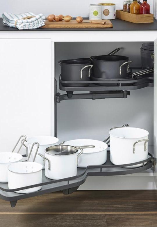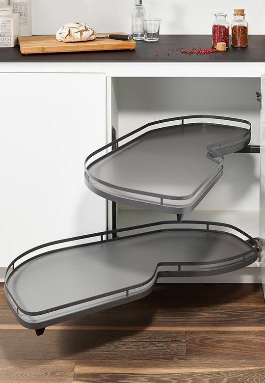 dwie półki górna i dolna poruszają się niezależnie od siebie, a po otwarciu szafki całkowicie wysuwają się na zewnątrz