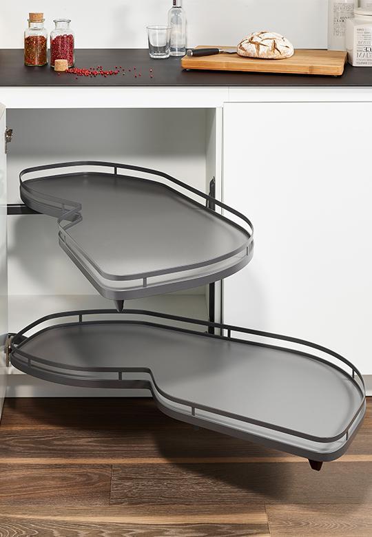 Oferowany system jest z koszami w linii ARENA Style - półka wykończona jest płaskim pojedynczym relingiem, dno koszy wykonane z drewna pokryte jest specjalną powłoką antypoślizgową RutschStopp. Całość jest w kolorze antracytowym. Półki LeMans II posiadają opływowy kształt, dzięki temu naczynia idealnie się na nich układają. Długość półki to 950 mm, w najszerszym miejscu do dyspozycji mamy 390 mm powierzchni użytkowej (pomiar półki na części od strony szafki), natomiast w drugim najszerszym miejscu to aż 450 mm (pomiar półki na części od strony frontu). Powierzchnia użytkowa każdej z półki to 0,340 m2.