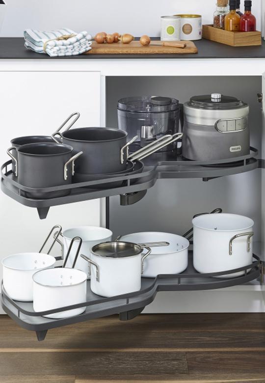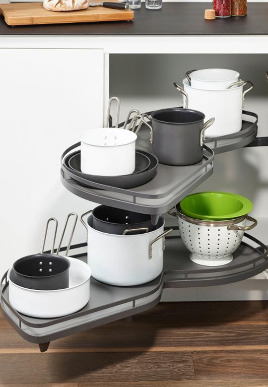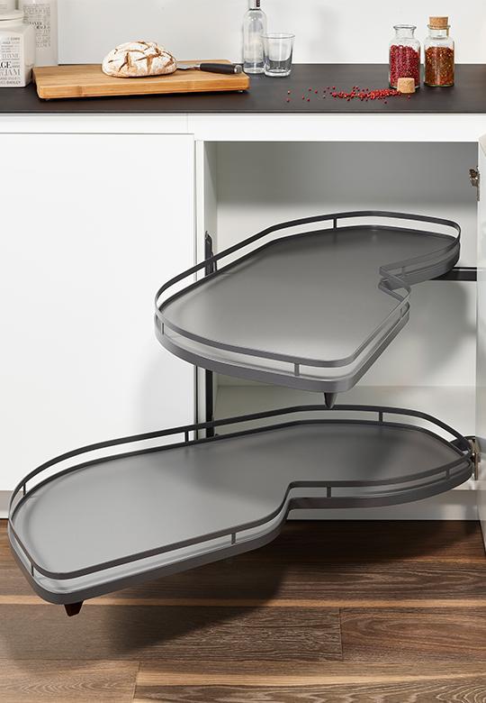 Półki LeMans II posiadają opływowy kształt, dzięki temu naczynia idealnie się na nich układają. Długość półki to 950 mm, w najszerszym miejscu do dyspozycji mamy 390 mm powierzchni użytkowej (pomiar półki na części od strony szafki), natomiast w drugim najszerszym miejscu to aż 450 mm (pomiar półki na części od strony frontu). Powierzchnia użytkowa każdej z półki to 0,340 m2.