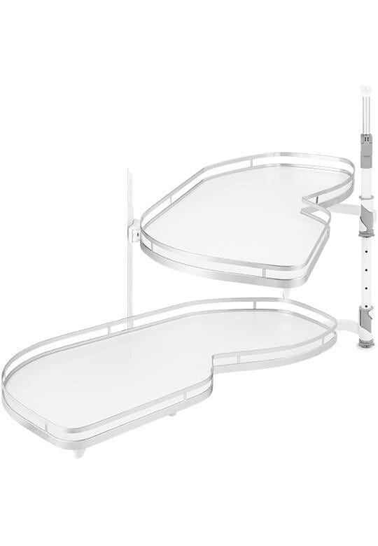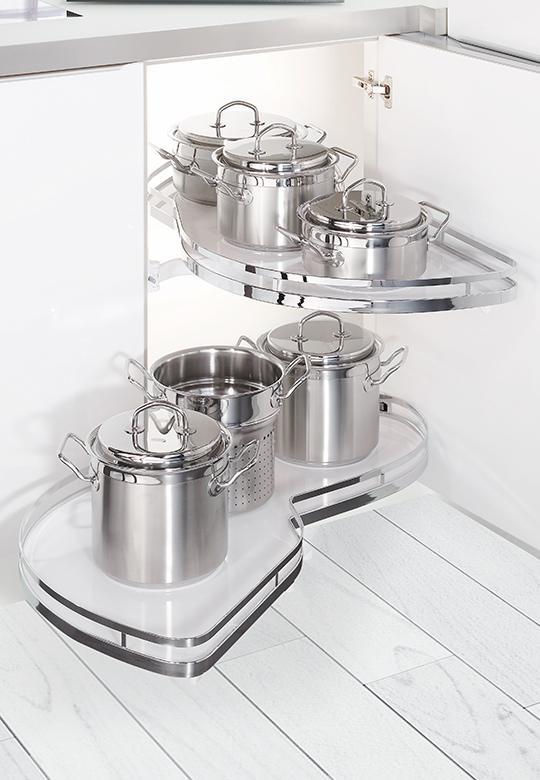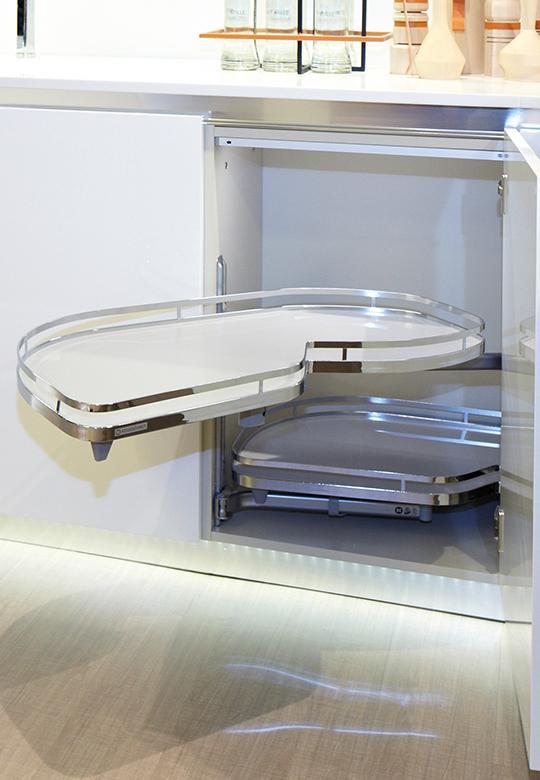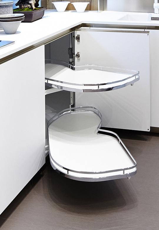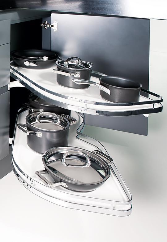Półki LeMans II posiadają opływowy kształt, dzięki temu naczynia idealnie się na nich układają. Długość półki to 950 mm, w najszerszym miejscu do dyspozycji mamy 390 mm powierzchni użytkowej (pomiar półki na części od strony szafki), natomiast w drugim najszerszym miejscu to aż 450 mm (pomiar półki na części od strony frontu). Powierzchnia użytkowa każdej z półki to 0,340 m2.