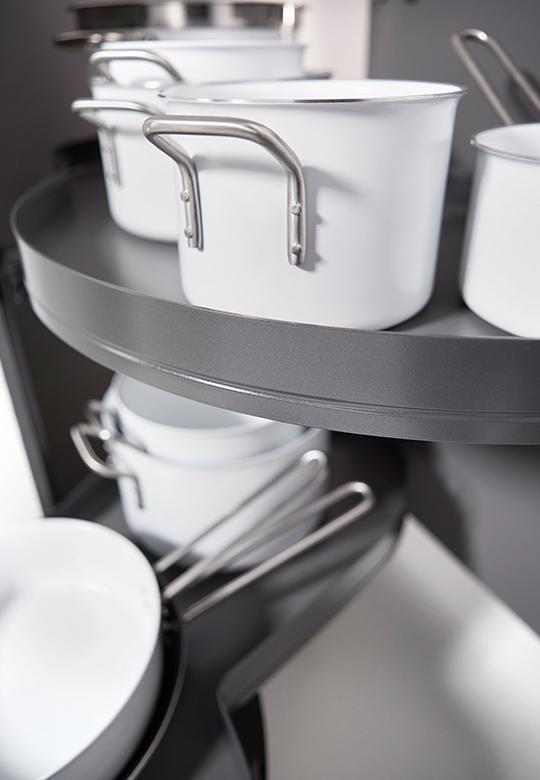 Oferowany system jest z koszami w linii ARENA Pure - półka wykończona jest płaską aluminiową barierką malowana proszkowo, dno koszy wykonane z drewna pokryte jest specjalną powłoką antypoślizgową RutschStopp. Półki LeMans II posiadają opływowy kształt, dzięki temu naczynia idealnie się na nich układają. Długość półki to 950 mm, w najszerszym miejscu do dyspozycji mamy 390 mm powierzchni użytkowej (pomiar półki na części od strony szafki), natomiast w drugim najszerszym miejscu to aż 450 mm (pomiar półki na części od strony frontu). Powierzchnia użytkowa każdej z półki to 0,340 m2.