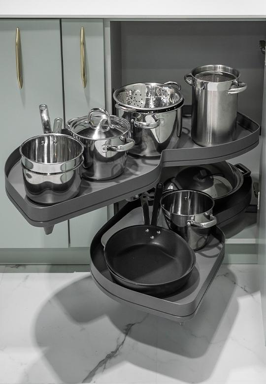 półki górna i dolna poruszają się niezależnie od siebie, a po otwarciu szafki całkowicie wysuwają się na zewnątrz