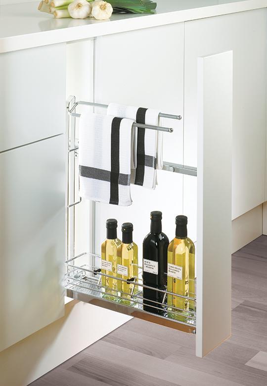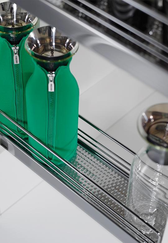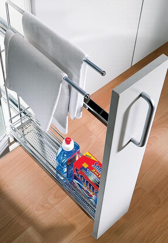 System "15" z wieszakiem i półką jest tak skonstruowany, że stanowi integralną całość ze sobą, dostępny jest jako kompletne cargo z dwoma wieszakami na ścierki i jedną dolną półką. Cały stelaż i dolna półka wykonane są ze stali chromowanej. Półka posiada fakturowane dno spełniające funkcję antypoślizgową, a boczne ścianki wykończenie są trzema okrągłymi relingami. Natomiast na wieszaczki dodatkowo nałożona jest specjalną gumową powłoką, która zapobiega zsuwaniu się umieszczonych na nich ściereczek kuchennych.