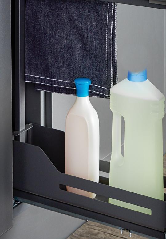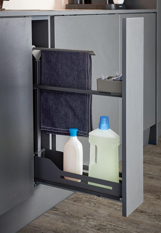 Wykończenie w modnym kolorze antracytowym sprawia, że system Snello Libell doskonale wpisuje się w nowoczesne aranżacje kuchni. Cienkościenna metalowa półka z zaokrąglonymi narożnikami to znak rozpoznawczy linii Libell – gwarantuje elegancki wygląd, trwałość i łatwość w utrzymaniu czystości. Brak ostrych krawędzi oraz szczelin minimalizuje gromadzenie się zabrudzeń, a antypoślizgowa mata na dnie półki chroni przechowywane przedmioty przed przesuwaniem.