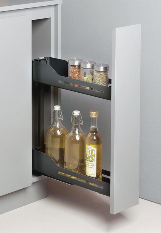 Pełna wygoda użytkowania z systemem Snello. Dzięki pełnemu wysuwowi i cichym domykaniu prowadnic, zawartość szafki można jednym ruchem ręki wygodnie wysunąć na zewnątrz. Po otwarciu uzyskujemy swobodny dostęp do produktów z każdej strony: z lewej, prawej, a nawet od góry.