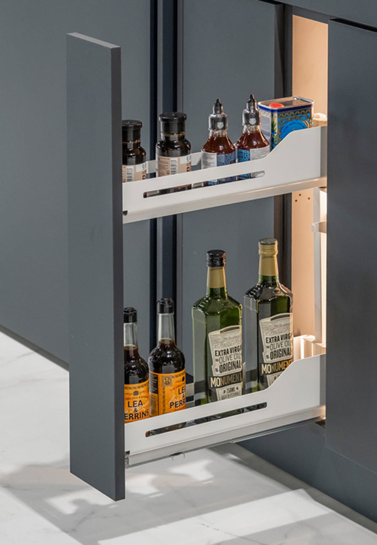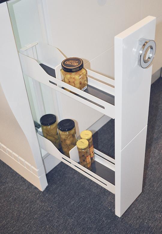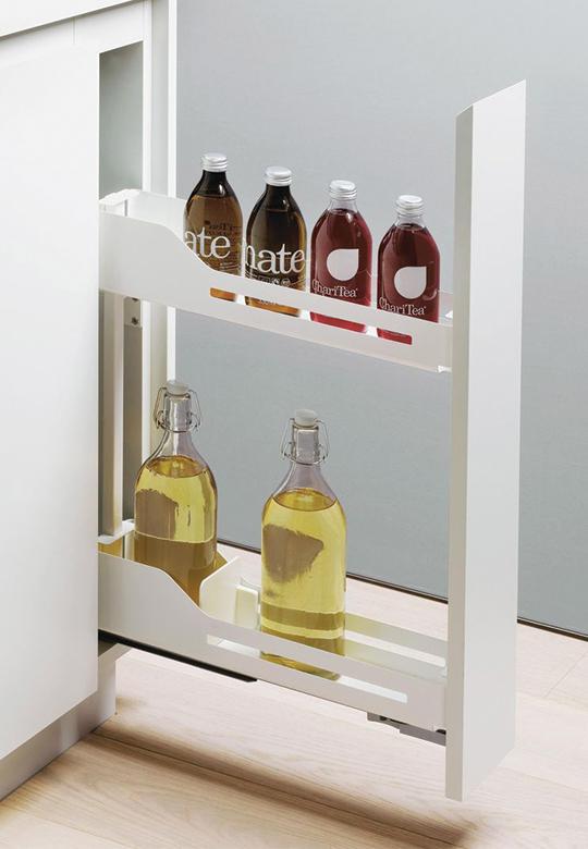 Pełna wygoda użytkowania z systemem Snello. Dzięki pełnemu wysuwowi i cichym domykaniu prowadnic, zawartość szafki można jednym ruchem ręki wygodnie wysunąć na zewnątrz. Po otwarciu uzyskujemy swobodny dostęp do produktów z każdej strony: z lewej, prawej, a nawet od góry. Kolejną z największych zalet systemu Snello jest możliwość łatwego zdjęcia górnego koszyka ze stelaża. Ta funkcja będzie szczególnie cenna dla miłośników gotowania, którzy często korzystają z przypraw czy dodatków kulinarnych przechowywanych w cargo.