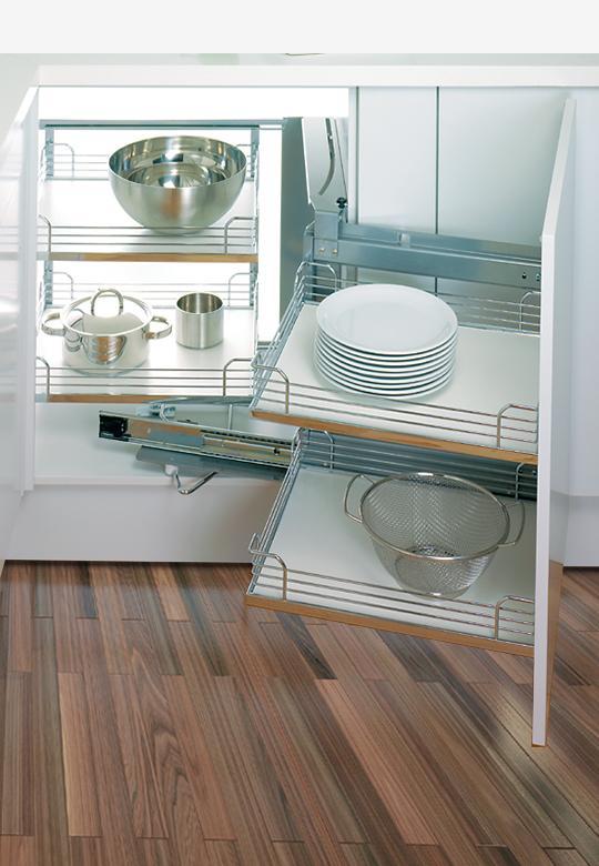 Magic Corner ARENA Classic to idealne rozwiązanie do przechowywania zarówno większych garnków i urządzeń kuchennych, jak i drobniejszych artykułów, takich jak zastawa stołowa czy produkty spożywcze. Zapewnia maksymalne wykorzystanie narożnej przestrzeni, poprawiając ergonomię i wygodę pracy w kuchni.