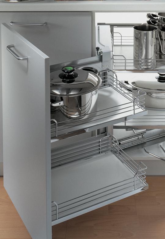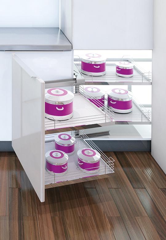 Magic Corner ARENA Classic to idealne rozwiązanie do przechowywania zarówno większych garnków i urządzeń kuchennych, jak i drobniejszych artykułów, takich jak zastawa stołowa czy produkty spożywcze. Zapewnia maksymalne wykorzystanie narożnej przestrzeni, poprawiając ergonomię i wygodę pracy w kuchni.