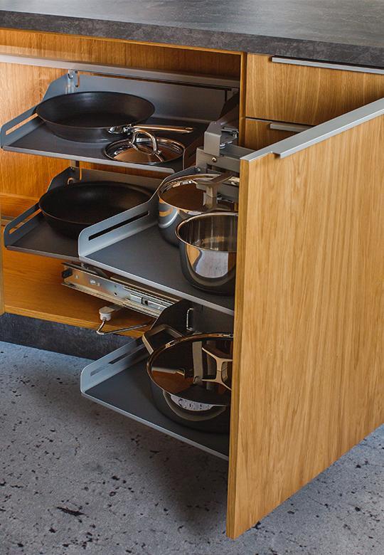 Pojedynczy ruch przenosi przedmioty przechowywane w trudno dostępnym kącie do przedniej części szafki. Płynny ruch zapobiega wypadaniu przechowywanych przedmiotów, natomiast prostokątny kształt półek jest bardzo praktyczny do optymalnego wykorzystania przestrzeni do przechowywania.