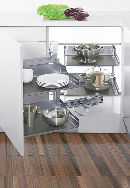 Pojedynczy ruch przenosi przedmioty przechowywane w trudno dostępnym kącie do przedniej części szafki. Płynny ruch zapobiega wypadaniu przechowywanych przedmiotów, natomiast prostokątny kształt półek jest bardzo praktyczny do optymalnego wykorzystania przestrzeni do przechowywania.