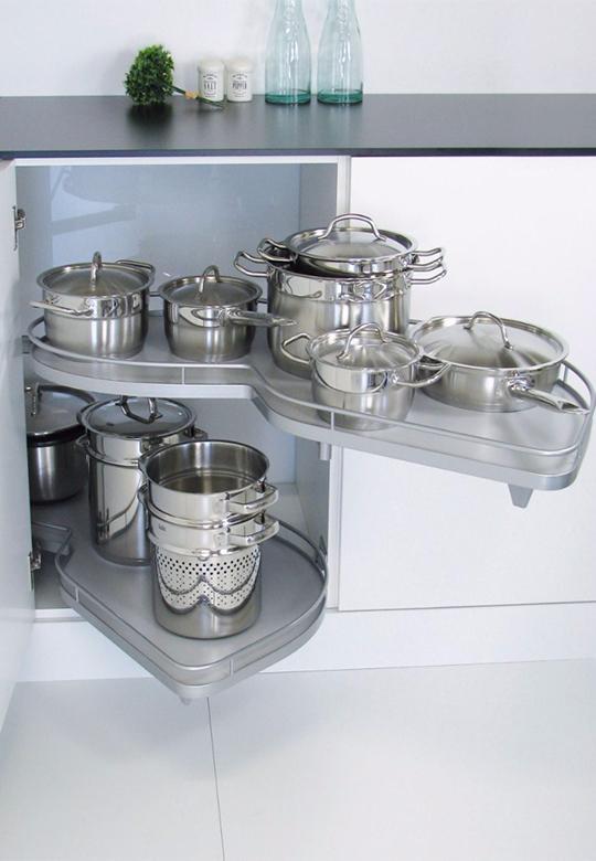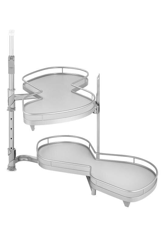 Oferowany system jest z koszami w linii ARENA Classic Silver. Półki LeMans II posiadają opływowy kształt, dzięki temu naczynia idealnie się na nich układają. Długość półki to 760 mm, w najszerszym miejscu do dyspozycji mamy 350 mm powierzchni użytkowej (pomiar półki na części od strony szafki), natomiast w drugim najszerszym miejscu to aż 320 mm (pomiar półki na części od strony frontu). Powierzchnia użytkowa każdej z półki to 0,185 m2.