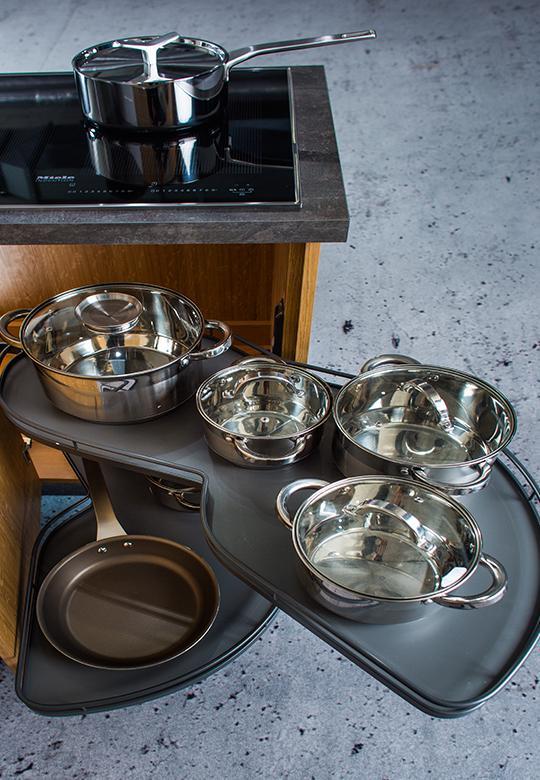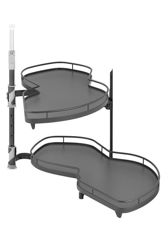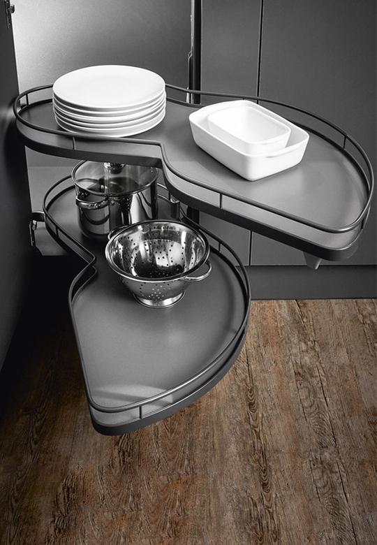 Oferowany system jest z koszami w linii ARENA Classic z okrągłym relingiem, całość w kolorze antracytowym. Półki LeMans II posiadają opływowy kształt, dzięki temu naczynia idealnie się na nich układają. Długość półki to 799 mm, w najszerszym miejscu do dyspozycji mamy 350 mm powierzchni użytkowej (pomiar półki na części od strony szafki), natomiast w drugim najszerszym miejscu to aż 395 mm (pomiar półki na części od strony frontu). Powierzchnia użytkowa każdej z półki to 0,233 m2.
