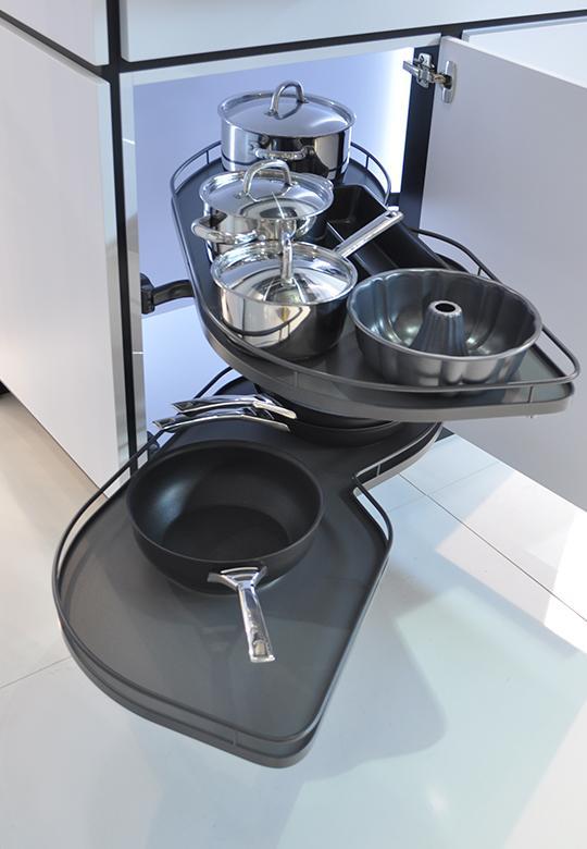 Oferowany system jest z koszami w linii ARENA Classic - kosze z chromowanym, okrągłym relingiem. Półki LeMans II posiadają opływowy kształt, dzięki temu naczynia idealnie się na nich układają. Długość półki to 799 mm, w najszerszym miejscu do dyspozycji mamy 350 mm powierzchni użytkowej (pomiar półki na części od strony szafki), natomiast w drugim najszerszym miejscu to aż 395 mm (pomiar półki na części od strony frontu). Powierzchnia użytkowa każdej z półki to 0,233 m2.
