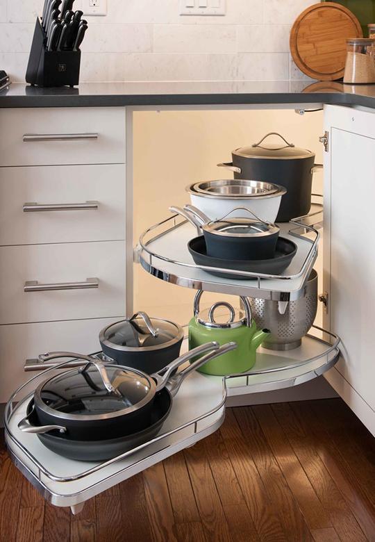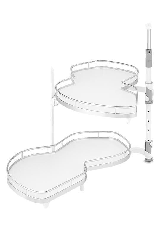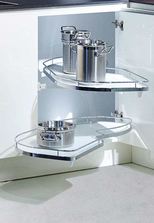 Oferowany system jest z koszami w linii ARENA Classic - kosze z chromowanym, okrągłym relingiem. Półki LeMans II posiadają opływowy kształt, dzięki temu naczynia idealnie się na nich układają. Długość półki to 799 mm, w najszerszym miejscu do dyspozycji mamy 350 mm powierzchni użytkowej (pomiar półki na części od strony szafki), natomiast w drugim najszerszym miejscu to aż 395 mm (pomiar półki na części od strony frontu). Powierzchnia użytkowa każdej z półki to 0,233 m2.
