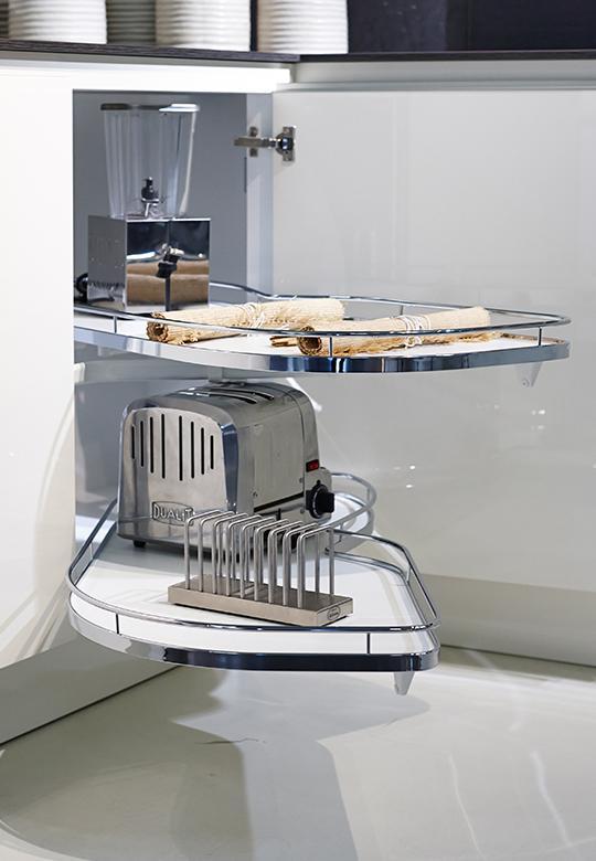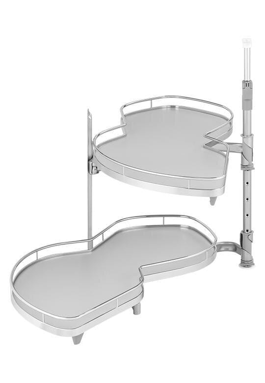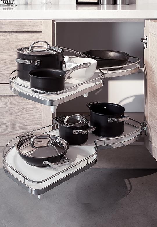 Oferowany system jest z koszami w linii ARENA Classic - kosze z chromowanym, okrągłym relingiem. Półki LeMans II posiadają opływowy kształt, dzięki temu naczynia idealnie się na nich układają. Długość półki to 799 mm, w najszerszym miejscu do dyspozycji mamy 350 mm powierzchni użytkowej (pomiar półki na części od strony szafki), natomiast w drugim najszerszym miejscu to aż 395 mm (pomiar półki na części od strony frontu). Powierzchnia użytkowa każdej z półki to 0,233 m2.