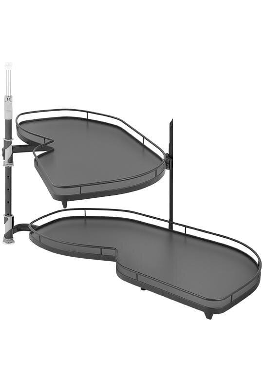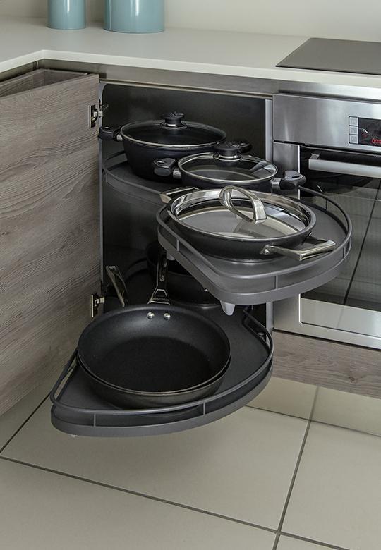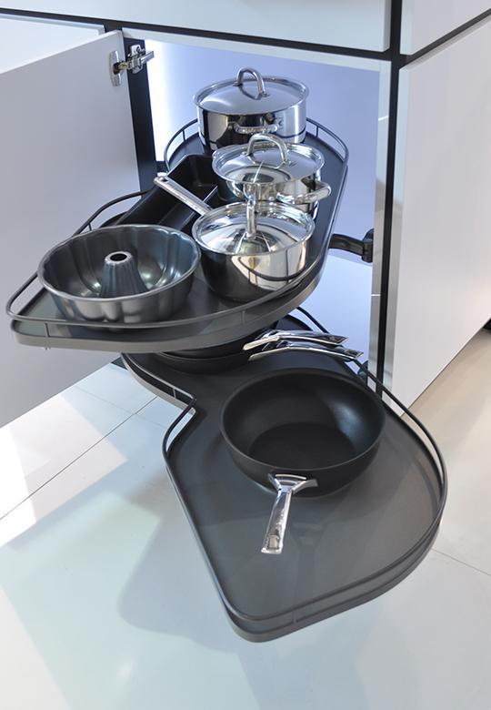 Oferowany system jest z koszami w linii ARENA Classic z okrągłym relingiem w kolorze antracytowym. Półki LeMans II posiadają opływowy kształt, dzięki temu naczynia idealnie się na nich układają. Długość półki to 950 mm, w najszerszym miejscu do dyspozycji mamy 390 mm powierzchni użytkowej (pomiar półki na części od strony szafki), natomiast w drugim najszerszym miejscu to aż 450 mm (pomiar półki na części od strony frontu). Powierzchnia użytkowa każdej z półki to 0,340 m2.