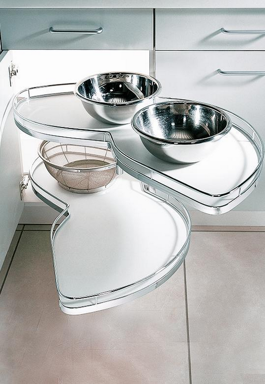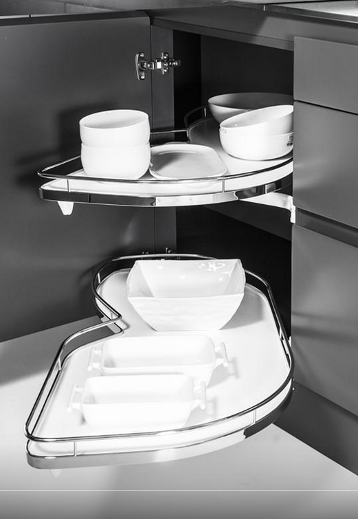 Oferowany system jest z koszami w linii ARENA Classic - kosze z chromowanym, okrągłym relingiem. Półki LeMans II posiadają opływowy kształt, dzięki temu naczynia idealnie się na nich układają. Długość półki to 950 mm, w najszerszym miejscu do dyspozycji mamy 390 mm powierzchni użytkowej (pomiar półki na części od strony szafki), natomiast w drugim najszerszym miejscu to aż 450 mm (pomiar półki na części od strony frontu). Powierzchnia użytkowa każdej z półki to 0,340 m2.