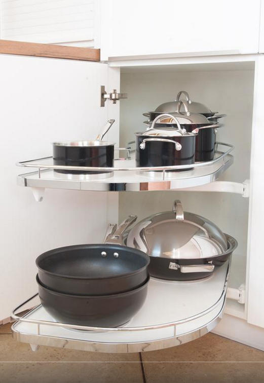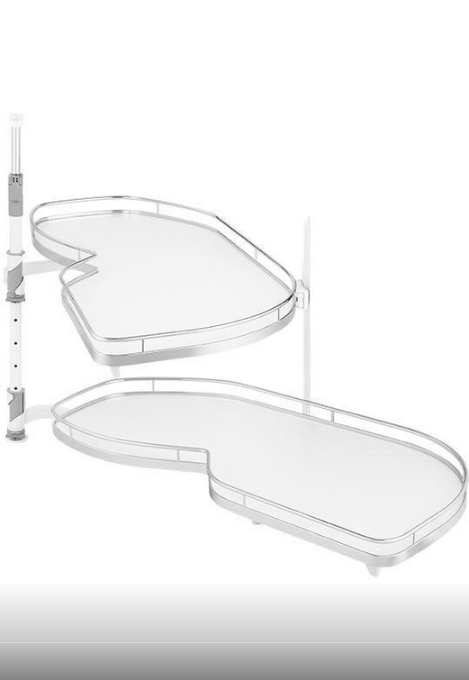 dwie półki górna i dolna poruszają się niezależnie od siebie, a po otwarciu szafki całkowicie wysuwają się na zewnątrz