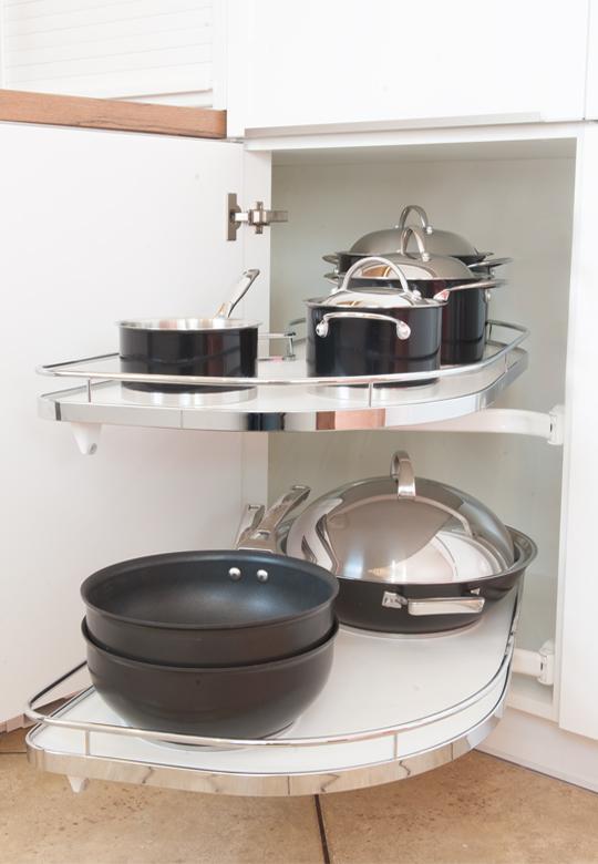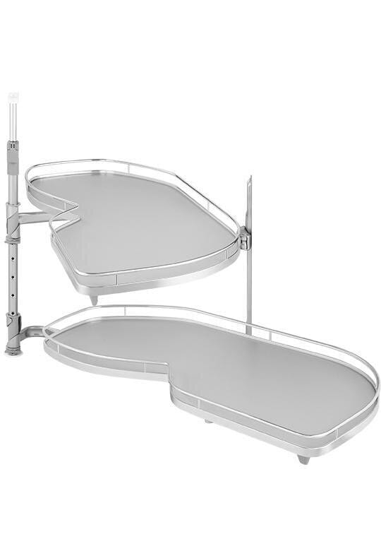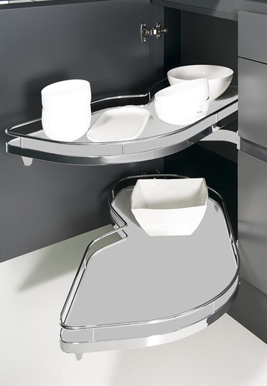 Oferowany system jest z koszami w linii ARENA Classic - kosze z chromowanym, okrągłym relingiem. Półki LeMans II posiadają opływowy kształt, dzięki temu naczynia idealnie się na nich układają. Długość półki to 950 mm, w najszerszym miejscu do dyspozycji mamy 390 mm powierzchni użytkowej (pomiar półki na części od strony szafki), natomiast w drugim najszerszym miejscu to aż 450 mm (pomiar półki na części od strony frontu). Powierzchnia użytkowa każdej z półki to 0,340 m2.