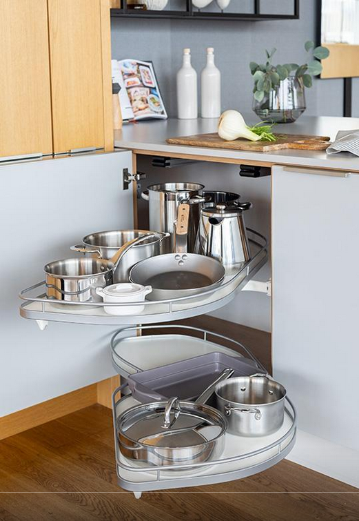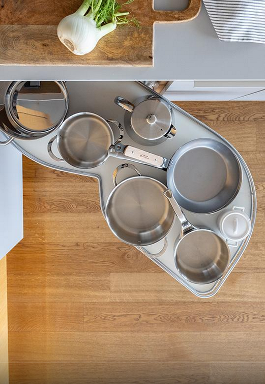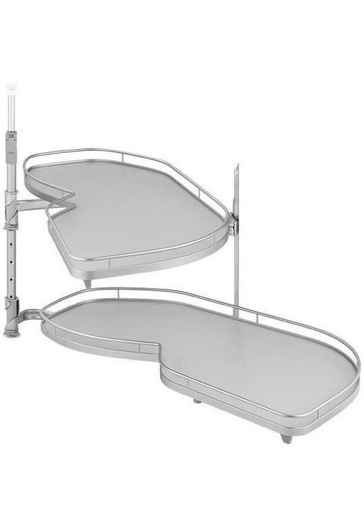 Oferowany system jest z koszami w linii ARENA Classic Silver. Półki LeMans II posiadają opływowy kształt, dzięki temu naczynia idealnie się na nich układają. Długość półki to 950 mm, w najszerszym miejscu do dyspozycji mamy 390 mm powierzchni użytkowej (pomiar półki na części od strony szafki), natomiast w drugim najszerszym miejscu to aż 450 mm (pomiar półki na części od strony frontu). Powierzchnia użytkowa każdej z półki to 0,340 m2.