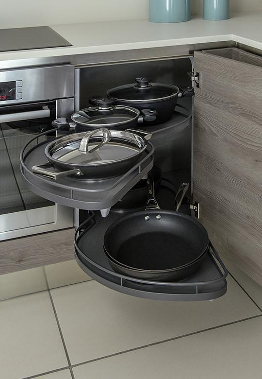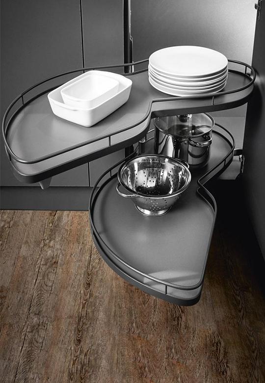 Oferowany system jest z koszami w linii ARENA Classic - kosze antracytowe z okrągłym relingiem. Półki LeMans II posiadają opływowy kształt, dzięki temu naczynia idealnie się na nich układają. Długość półki to 950 mm, w najszerszym miejscu do dyspozycji mamy 390 mm powierzchni użytkowej (pomiar półki na części od strony szafki), natomiast w drugim najszerszym miejscu to aż 450 mm (pomiar półki na części od strony frontu). Powierzchnia użytkowa każdej z półki to 0,340 m2.