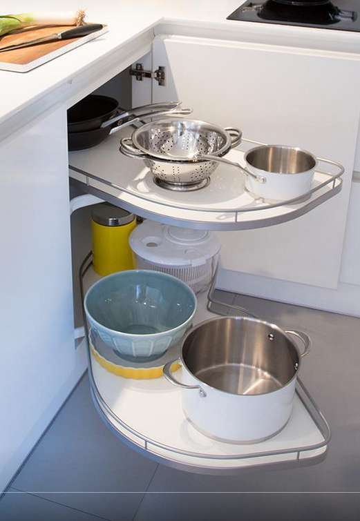 Oferowany system jest z koszami w linii ARENA Classic Silver. Półki LeMans II posiadają opływowy kształt, dzięki temu naczynia idealnie się na nich układają. Długość półki to 950 mm, w najszerszym miejscu do dyspozycji mamy 390 mm powierzchni użytkowej (pomiar półki na części od strony szafki), natomiast w drugim najszerszym miejscu to aż 450 mm (pomiar półki na części od strony frontu). Powierzchnia użytkowa każdej z półki to 0,340 m2.