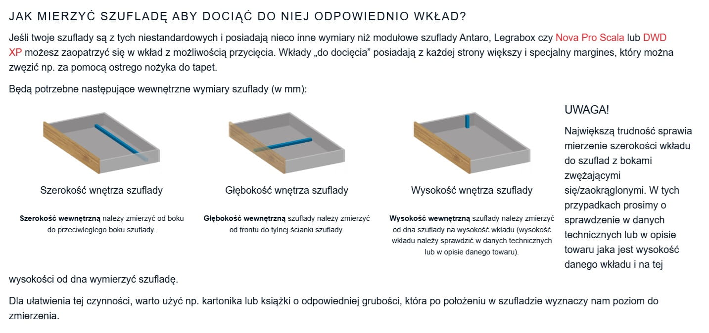 - 3x komory najmniejsze 170x93 mm (wymiar u góry komory), 145x65 mm (wymiar na dnie komory).