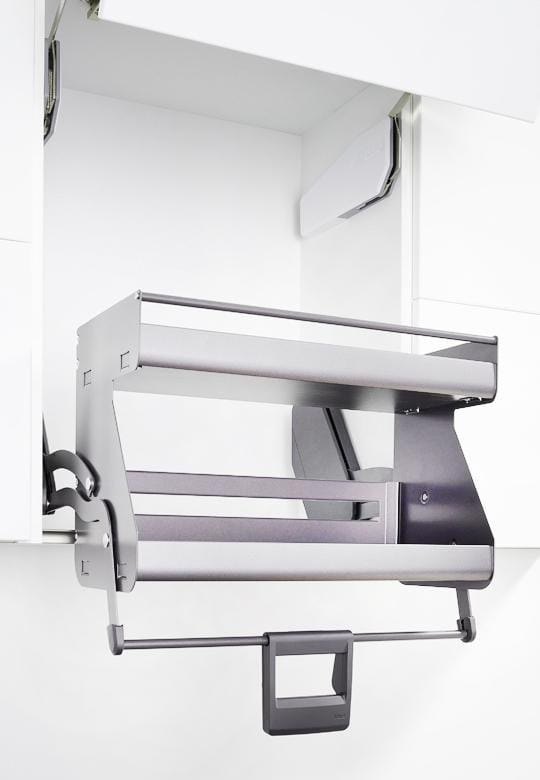 Mechanizm iMove montuje się w płytkich szafkach wiszących, a chwytając za uchwyt, jednym ruchem, całą zawartość półek opuszczamy w dół przed szafkę. Łatwość obsługi gwarantuje specjalny system sprężyn ukryty w mechanizmie. W uchwycie znajduje się automat blokowania tak aby w opuszczonej pozycji samoczynnie nie cofał się do górnego połażenia. Tak jak inne nasze systemy, również winda iMove doposażona jest w wyhamowanie, działające w kierunku zamykania.