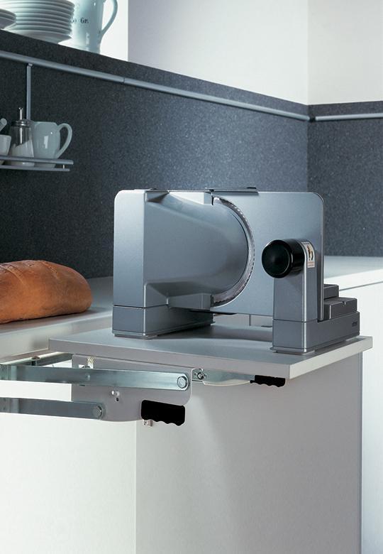 Gdy blat jest całkowicie wysunięty, tworzy równą powierzchnię z blatem roboczym (przy zastosowaniu blatu o tej samej grubości). Przy montażu bezpośrednio pod blatem roboczym, minimalna wysokość użytkowa w szafce wynosi 248 mm (minus grubość blatu krajalnicy), głębokość obrotu wynosi 440 mm. Aby prawidłowo zamontować system w szafce, konieczne jest spełnienie określonych parametrów, które szczegółowo opisano w instrukcji montażu. Przed zakupem systemu należy koniecznie zapoznać się z instrukcją montażu.