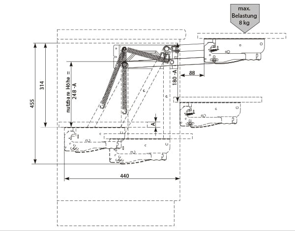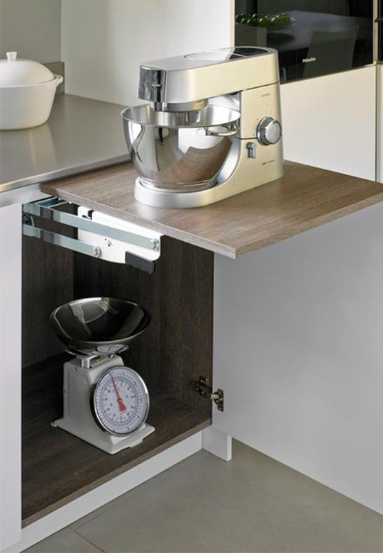 System przymocowywany jest wewnątrz szafki podblatowej. Gdy urządzenie nie jest potrzebne, można je jednym ruchem schować do szafki za frontem. Mechanizm jest stabilnie połączony belka łączącą. Jest łatwy w obsłudze, a jego działanie opiera się na wysuwaniu i podnoszeniu blatu, wspomaganym przez sprężyny naciągowe. Blat automatycznie blokuje się w odpowiedniej pozycji, a odblokowanie następuje po naciśnięciu dwóch uchwytów.