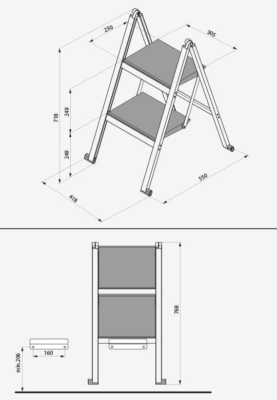 | Wymiary towaru | po złożeniu i przechowywaniu: - wysokość: 768 mm - szerokość: 418 mm - głębokość: 37 mm po otwarciu i użytkowaniu: - wysokość: 718 mm - szerokość: 418 mm - głębokość: 550 mm - wysokość pierwszego stopnia od podłogi 249 mm - wysokość drugiego stopnia od podłogi 448 mm |