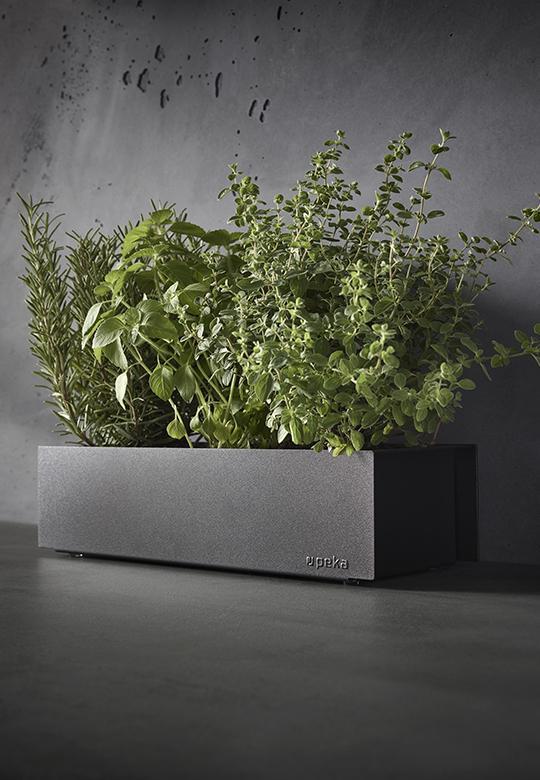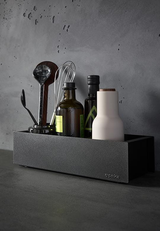 Piuro Box wykonany jest z wysokiej jakości drobno teksturowanej stali malowanej proszkowo w kolorze czarnym, a wykonanie go z jednego kawałka wysokogatunkowego metalu kwalifikuje go jako produkt bardzo ekologiczny. Piuro Box posiada wyprofilowane uchwyty, które chwyta się wygodnie i stabilnie. Wewnątrz na dnie, znajduje się tacka silikonowa, gładka i przyjemna w dotyku. Dopasowana indywidualnie tacka silikonowa z wyższym rantem, wyłapuje wilgoć z wody czy innych płynów nie pozwalając na wydostanie się na blat. Ponadto zabezpiecza dno pojemnika i ułatwia utrzymanie czystości na powierzchni blatu, parapetu. Wytłoczka nie jest przymocowana na stałe, dlatego można ją swobodnie wyciągnąć i umyć. Dodatkowo Piuro Box posiada od spodu specjalne antypoślizgowe nóżki, dzięki którym nie przesunie się niekontrolowanie. Stopki silikonowe pełną również funkcję ochronną, chroniąc powierzchnię meblową przed zarysowaniem.