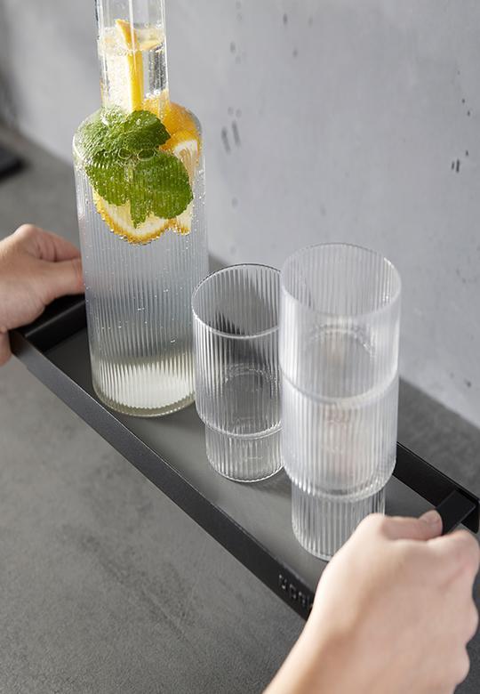 Tacka wykonana jest z drobno teksturowanej stali malowanej proszkowo w kolorze czarnym. Oryginalna budowa i wyprodukowanie z jednego odcinka metalu sprawiają, że tacka Piuro Mini Tray jest trwała i wygodna w użyciu a jednocześnie odporna na korozję. Piuro Mini Tray posiada wyprofilowane uchwyty, które chwyta się wygodnie i stabilnie. Wewnątrz znajduje się gładka, przyjemna w dotyku mata silikonowa przede wszystkim zabezpieczająca przed przesuwaniem się przedmiotów podczas serwowania, nie jest przymocowana na stałe, dlatego można ją swobodnie wyciągnąć i umyć. Dodatkowo Piuro Mini Tray posiada od spodu specjalne antypoślizgowe nóżki, dzięki którym nie przesuwa się niekontrolowanie. Stopki silikonowe pełną również funkcję ochronną, chroniąc powierzchnię meblową przed zarysowaniem.