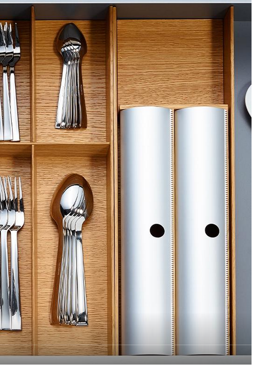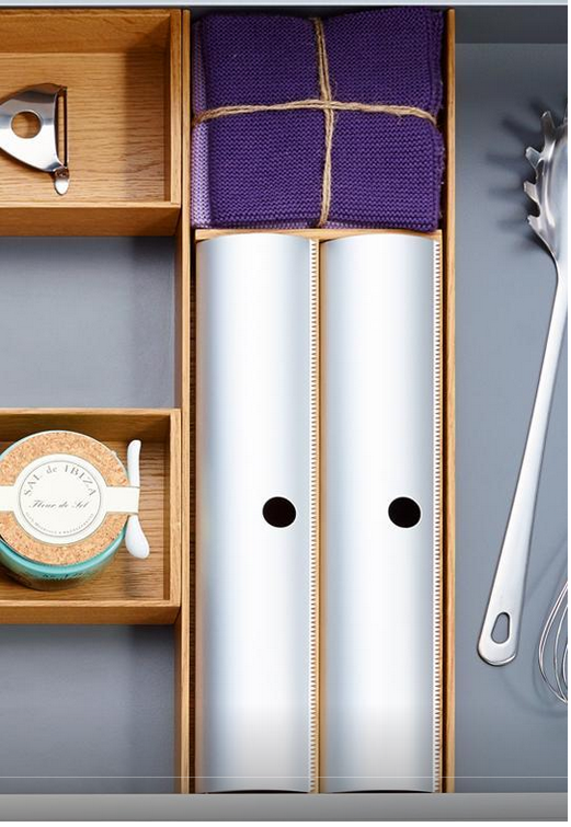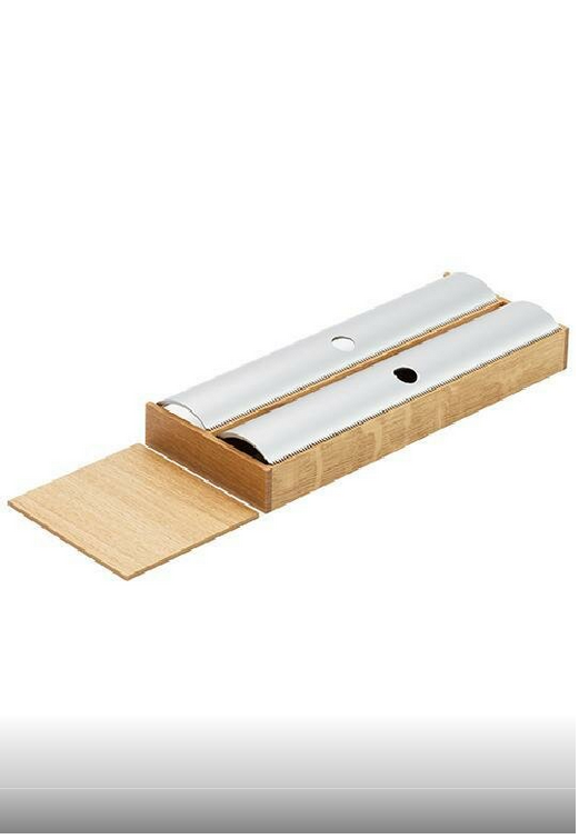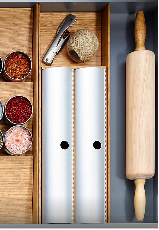 Drewniany wkład na folie spożywcze i aluminiowe z linii FineLine LiniQ z aluminiowymi, ruchomymi przykryciami wykończonymi ząbkami od obcinania folii. Wykonany z drewna dębowego, bardzo trwałego i niezwykle mocnego. Wkład mieści się w każdej szufladzie i w którym można przechowywać dwie rolki folii. Zestawiony z innymi elementami z tej samej linii tworzy unikatowy wystrój szuflady. Szerokość wkładu pozwala na umieszczenie kilku tych samych elementów w jednej szufladzie.