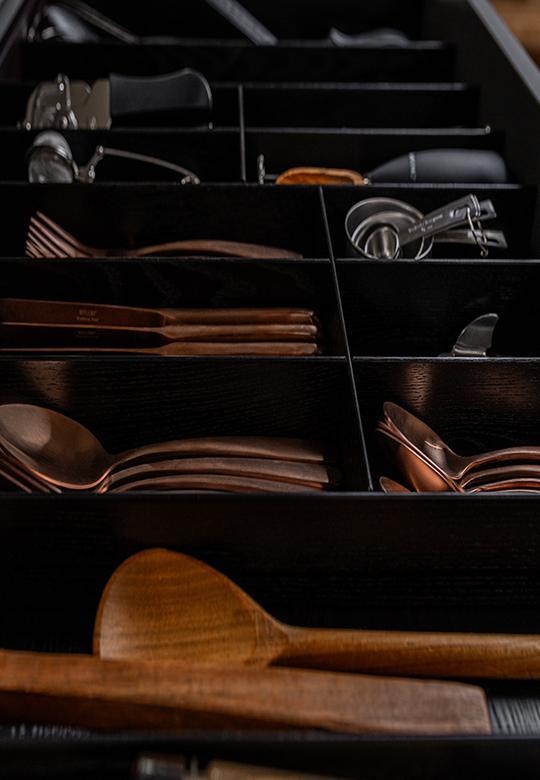 Wkład drewniany FineLine LiniQ posiada dużo miejsca na łyżki, widelce, noże i mniejsze sztućce. Produkty pokrewne z tej samej linii pomogą stworzyć idealny komplet organizerów do wielu szuflad do twojej kuchni.