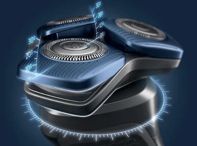 W pełni elastyczne głowice obracają się o 360°, aby podążać za konturem twarzy. Optymalny kontakt ze skórą zapewnia dokładne i wygodne golenie.